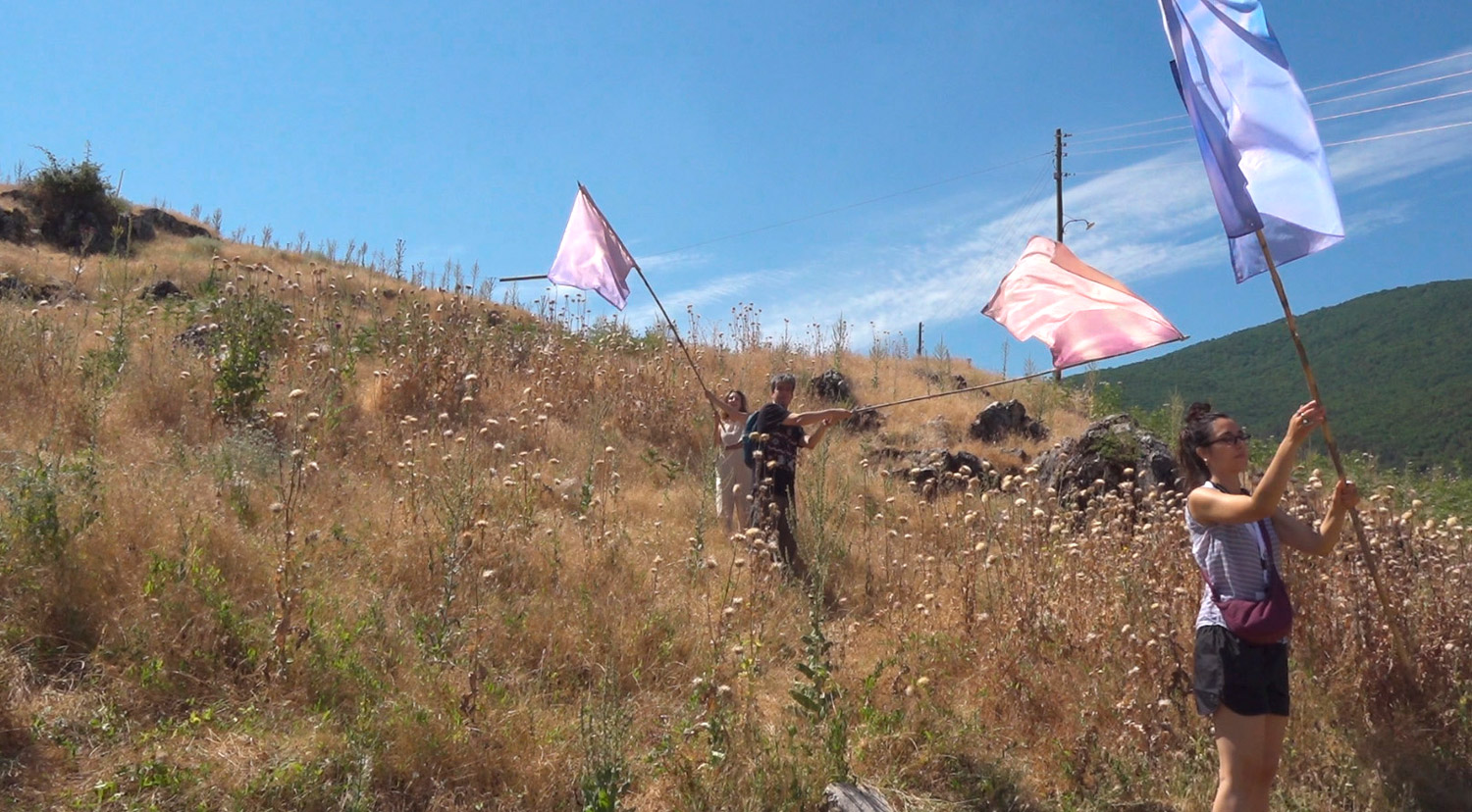 Four women from different parts of the world walked together through the Prespa borderlands, gathering branches, wild plants, and flowers. From these materials they wove interconnected wreaths, later released onto the lake at the tri-national meeting point. Drifting across the water, the wreaths formed a fragile yet resilient image of entanglement, articulating walking as a practice of coexistence and good neighbourliness.