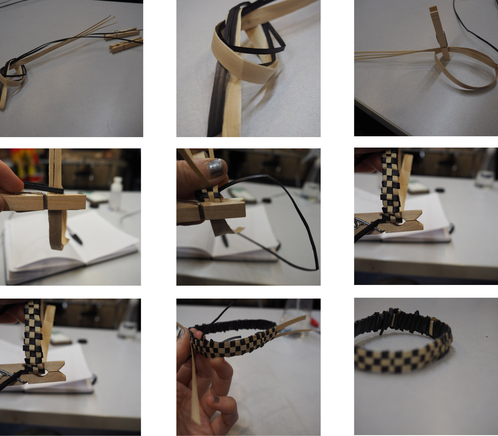 Collage documenting the process of creating an åkgak (pandanus) woven pair of earrings. These photographs were taken during a workshop I attended on the island of Guam in March 2024.