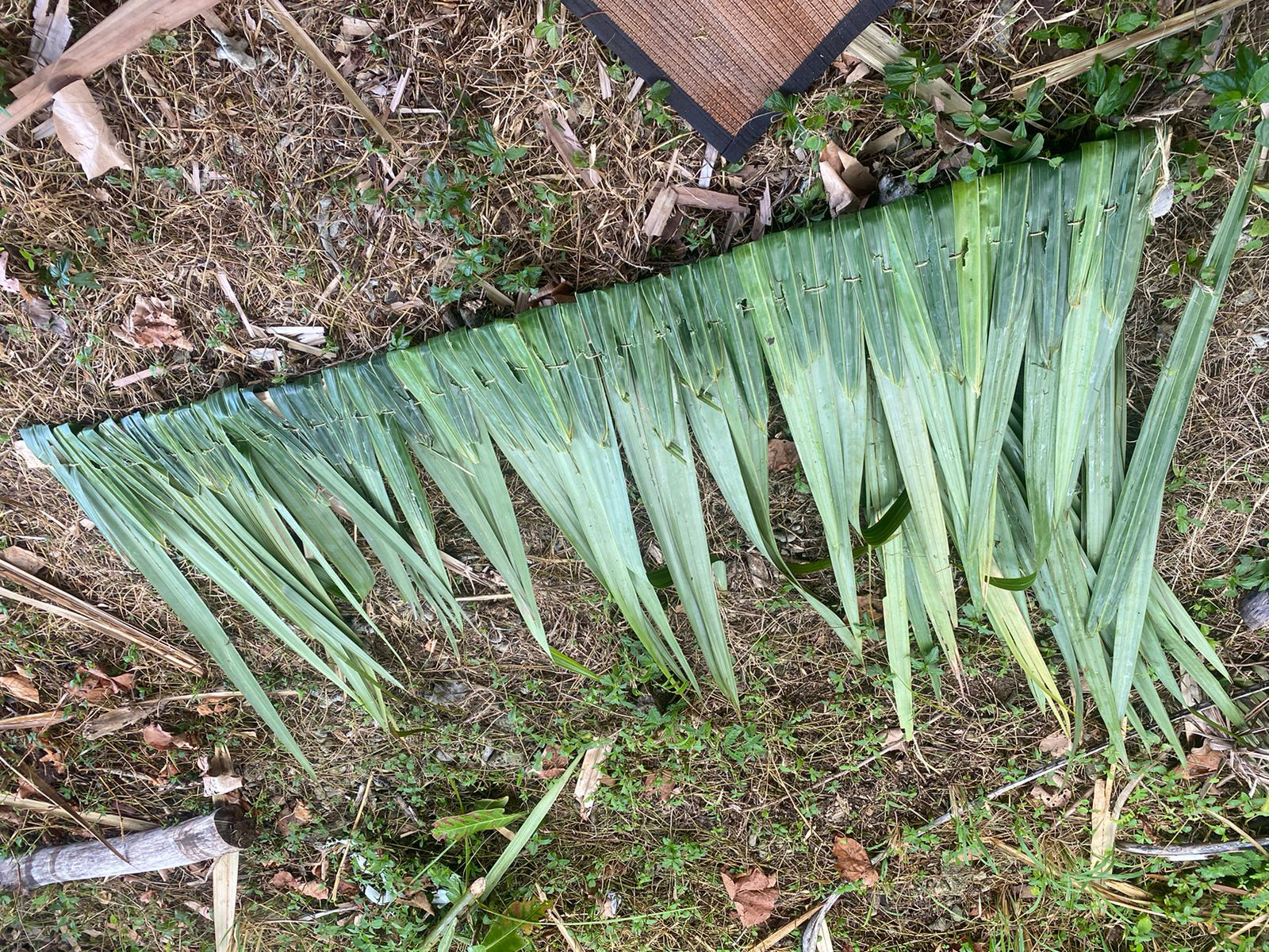 Photograph of my first finished nipa thatch. This was woven during the reconstruction of the canoe house at Pedro Santos Park in Piti, Guam in February 2024.